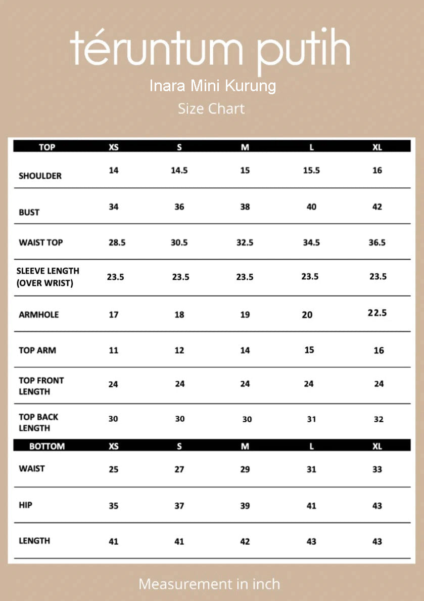 *XXL and XXXL size subject to additional charges of RM50 and RM100, respectively, for extra materials, beading and french lace cost required.