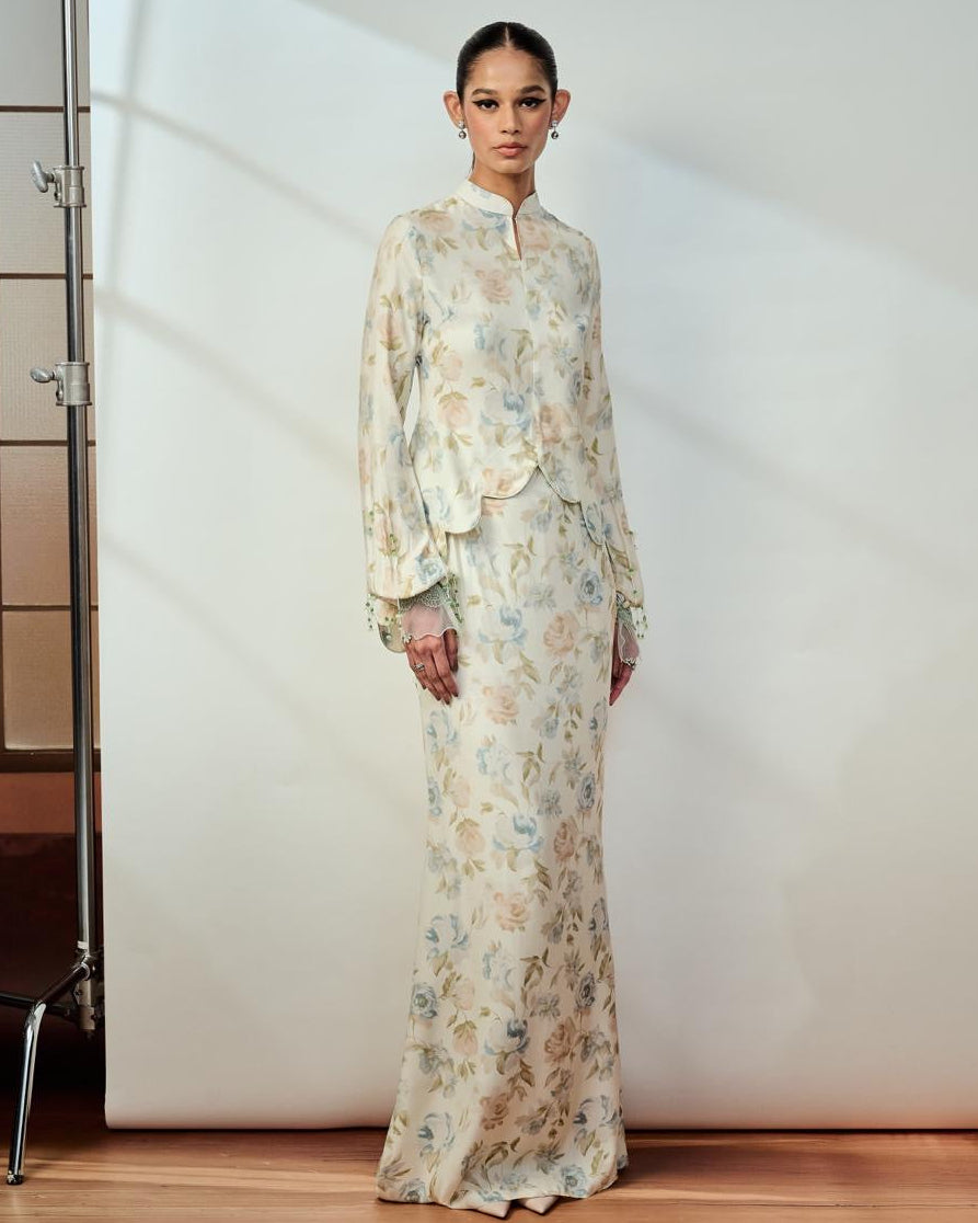 Ophelia Printed Kurung (Cloud Dancer with Pastel Green)